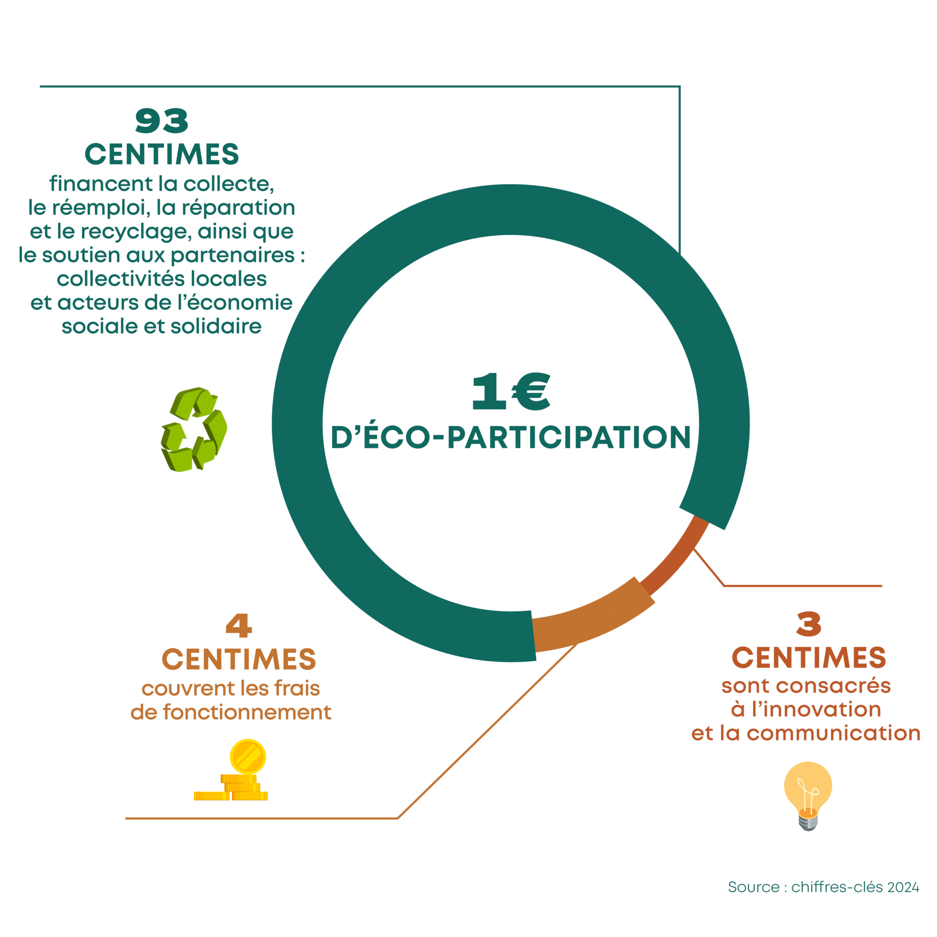 - 93 centimes financent la collecte, le réemploi, la réparation et le recyclage, ainsi que le soutien aux partenaires : collectivités locales et acteurs de l’économie sociale et solidaire,