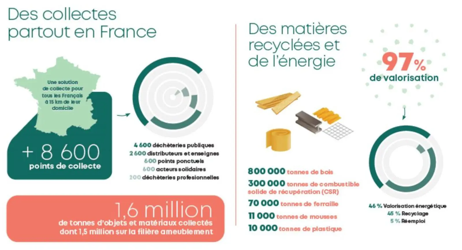 Son réseau de partenaires de collecte constitué de 8 600 points sur le territoire (déchèteries publiques et professionnelles, distributeurs et enseignes, acteurs solidaires) permet à Ecomaison de proposer un point de collecte dans un rayon de 15 km à tous les Français. Les performances de recyclage atteignent un taux de valorisation de 97% sur les produits pris en charge par Ecomaison, comprenant le réemploi, le recyclage et la valorisation énergétique.