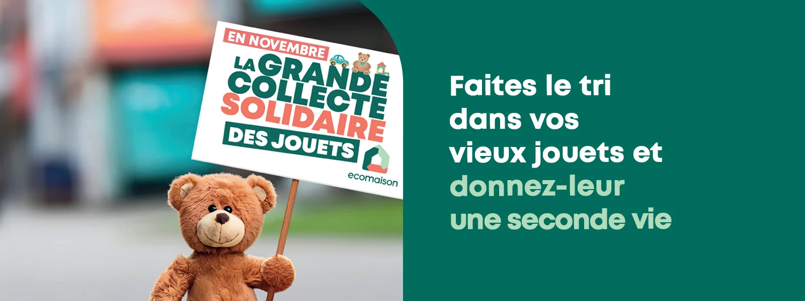 Peluches délavées, puzzles incomplets, petites voitures rayées… Et si vos vieux jouets devenaient le cadeau de Noël d’un autre enfant ? Ecomaison lance la Grande Collecte Solidaire des Jouets tout le mois de novembre pour transformer ces compagnons d’enfance oubliés en nouvelles histoires.