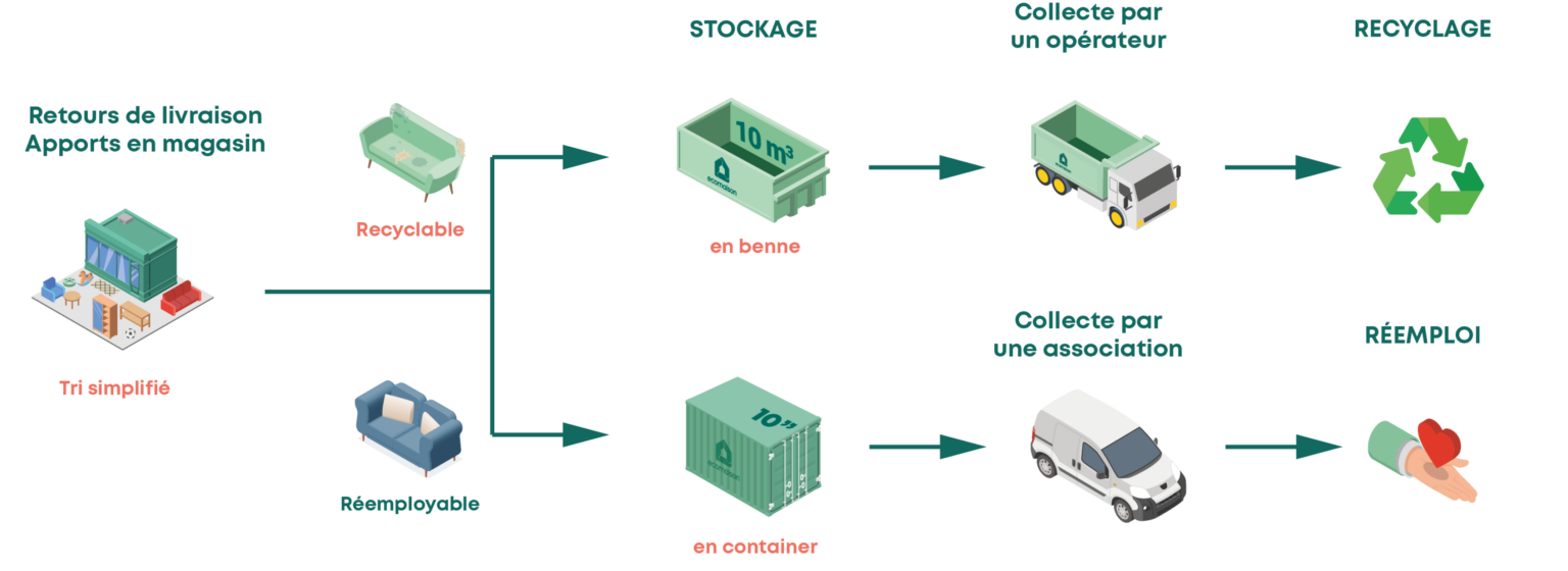 Pour organiser la reprise par les enseignes qui collectent ainsi des produits toute l’année, nous avons des solutions de collecte avec des contenants adaptés à la taille des produits repris : bacs de collecte pour les jouets et petits articles de bricolage et jardin à disposer à l’entrée du magasin, benne installée à l’arrière du magasin pour les matelas et autres canapés par exemple.